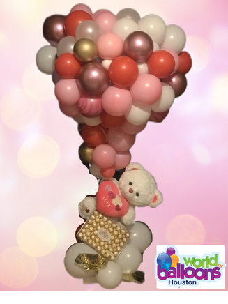 1 large plush Bear, 1 base Box of Chocolate, latex balloons 5", 9" and 11" balloons pink, light pink, white, gold, chrome, different colors.