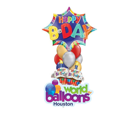 1 Jumbo topper balloon Happy B-DAY, 7 Latex 11in, 2 Mylar cupcake 18” (design and color may vary)