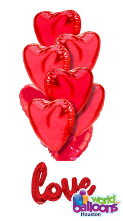 1 Love Shape, 9 Red heart mylar balloons 18" (design and colors may vary), 1 weight