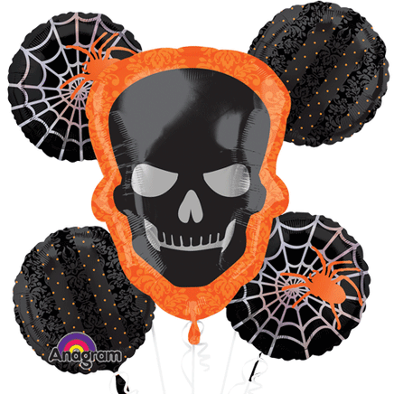 This creepy and cute Halloween Balloon Bouquet shows off a double sided designs, in one LARGE skull balloon and four circle balloons! This Skull Balloon measures 24" inches and is double sided and the four circle balloons measure 18" inches and are double sided.
